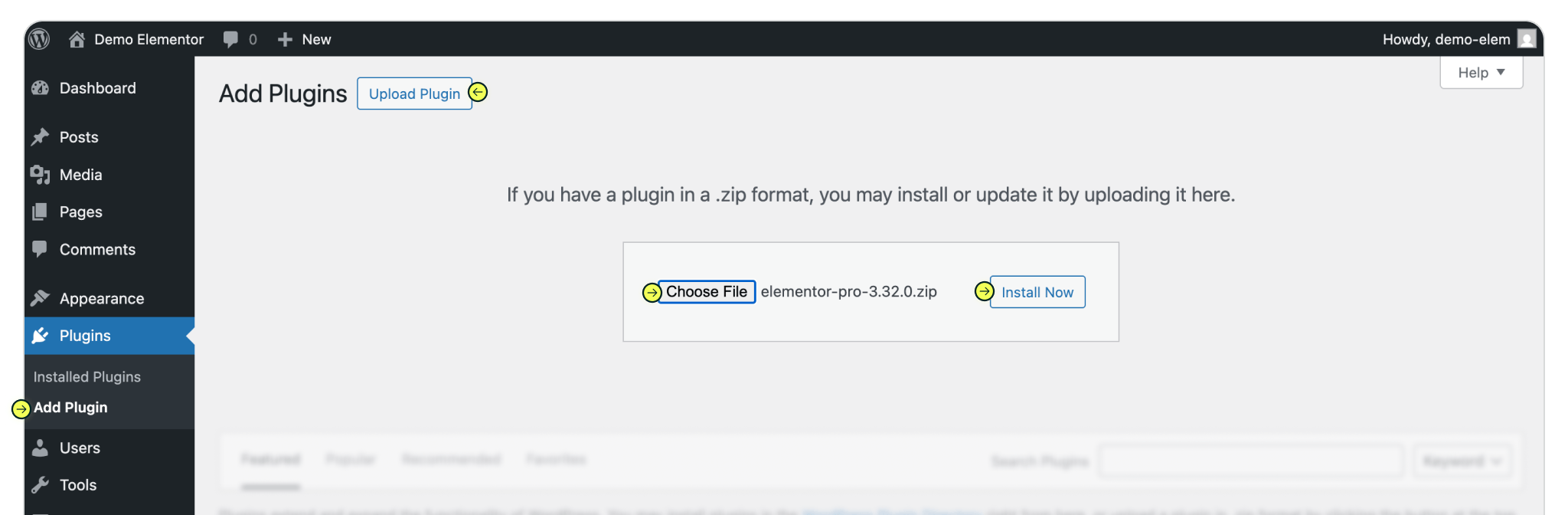 To begin select 'Plugins' from the sidebar menu and click the 'Add Plugin' button from the page or select the 'Add plugin' dropdown menu item. A. Search for 'Elementor' via the Search Plugins textfield input. Once the plugin has been found, install it. Once installed the plugin must be activated by clicking the 'Activate' button. B. Upload the Pro Elementor plugin, by clicking "Upload Plugin", choose your Elementor Pro Zip file (Elementor > Account Settings > Subscriptions), click 'Install Now'.