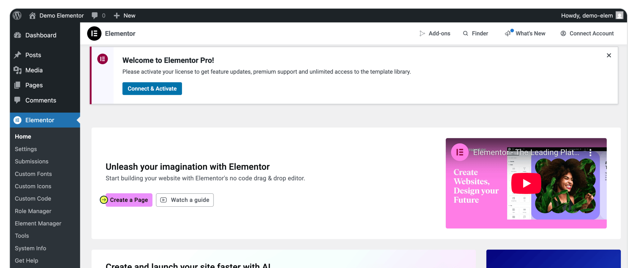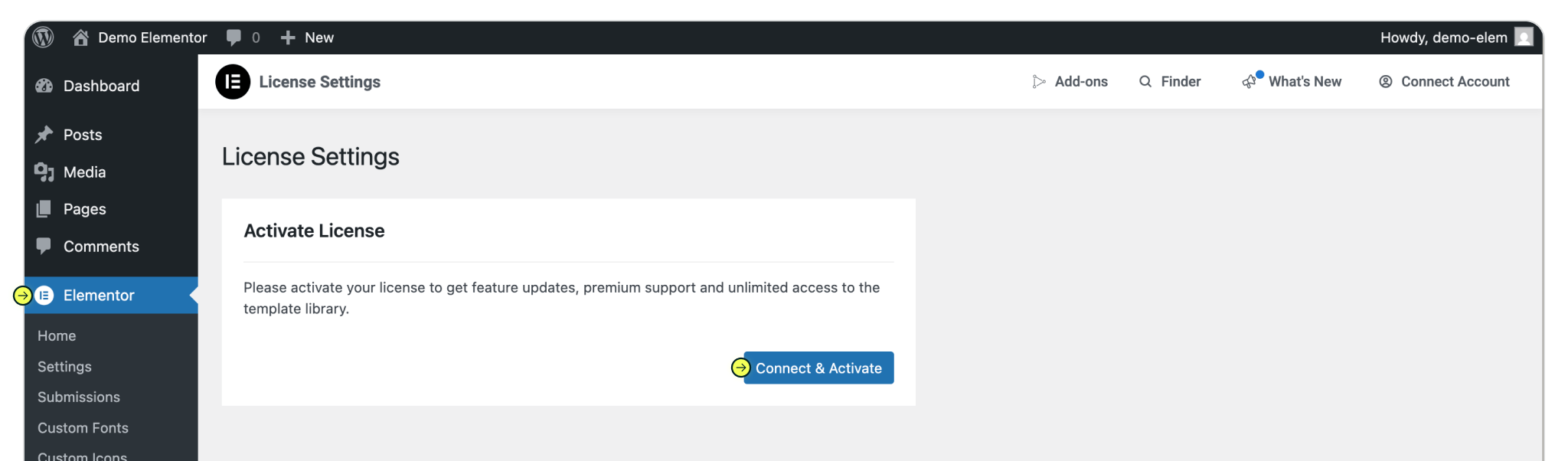 Once the Elementor Pro plugin is installed, Activate the plugin and Elementor License. To enable the plugin, click 'Activate'. To activate the license, click "Connect & Activate" and follow the Elementor instructions.