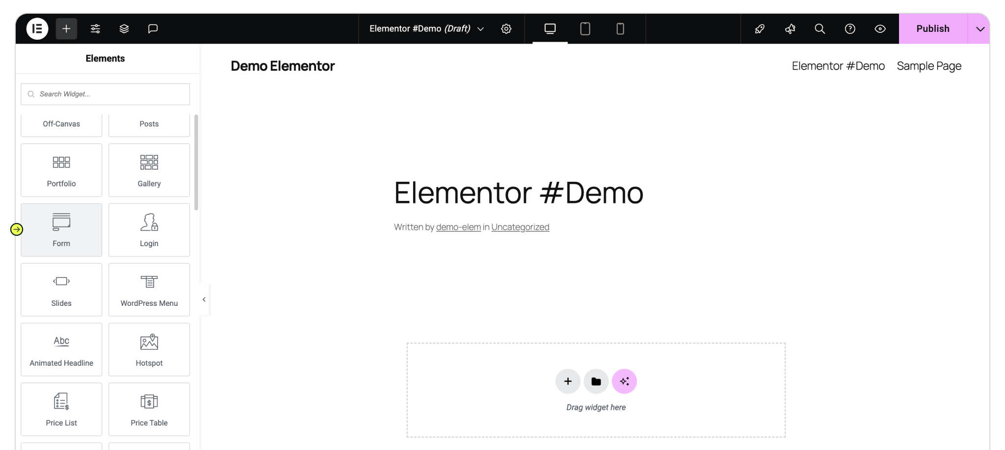 With Elementor Pro installed, you’re ready to build a form that will capture both your lead details and Madlitics attribution data. Navigate to the Elementor menu item in the Wordpress sidebar. Create a new page click the 'Create a Page' button, and add a Form widget the page. Select the form widget from the page to access the form editor panel.