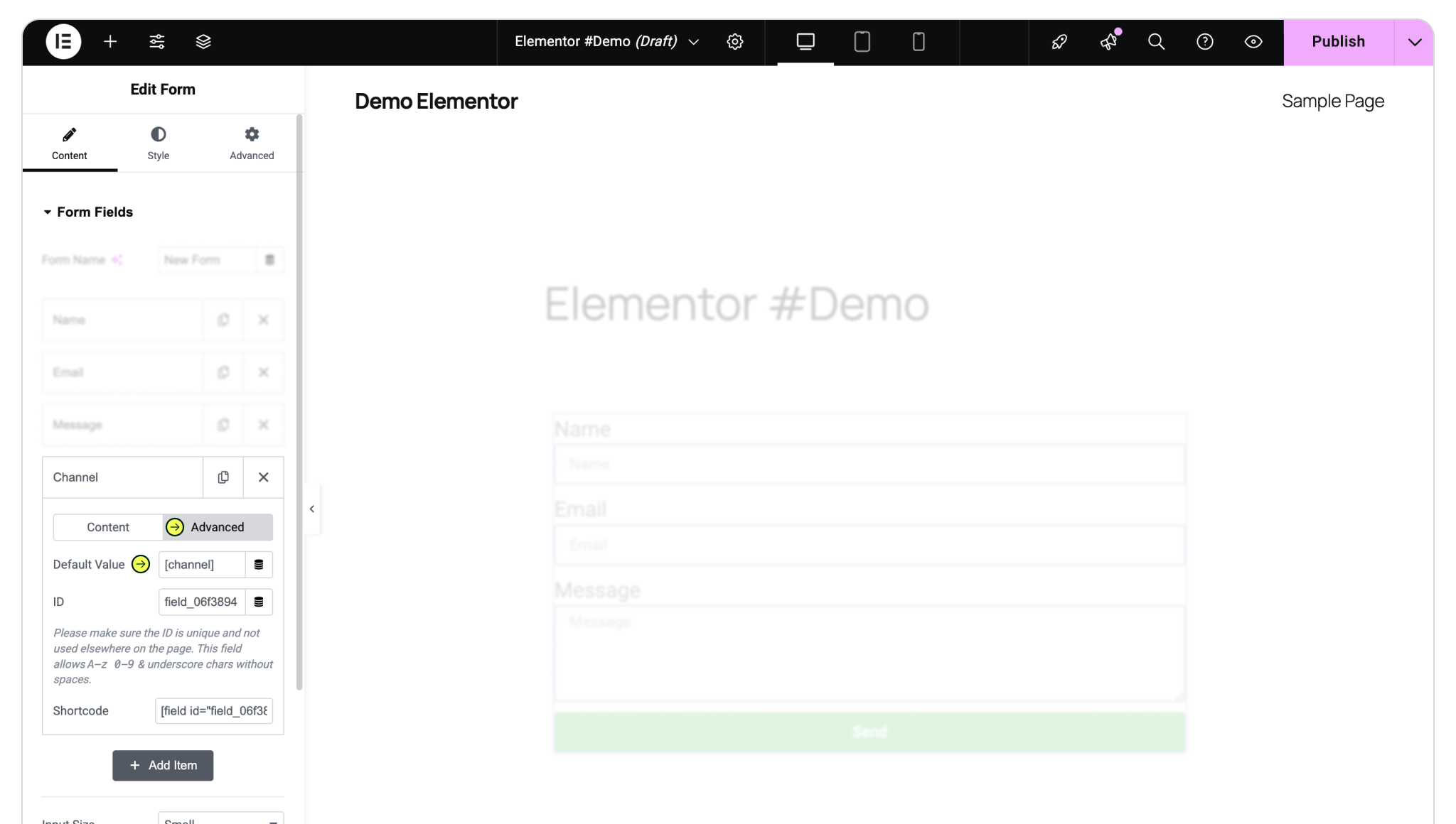 Within the Content tab of the form editor, under Form Fields, click "+ Add Item" to add a new field, we'll use this for Madlitics Field 1. Within the new item, select the Type (of field) and choose "Hidden. Input 'Channel' as the Label value (matching our label value for Madlitics Field 1). Change to the 'Advanced' tab and input [channel]