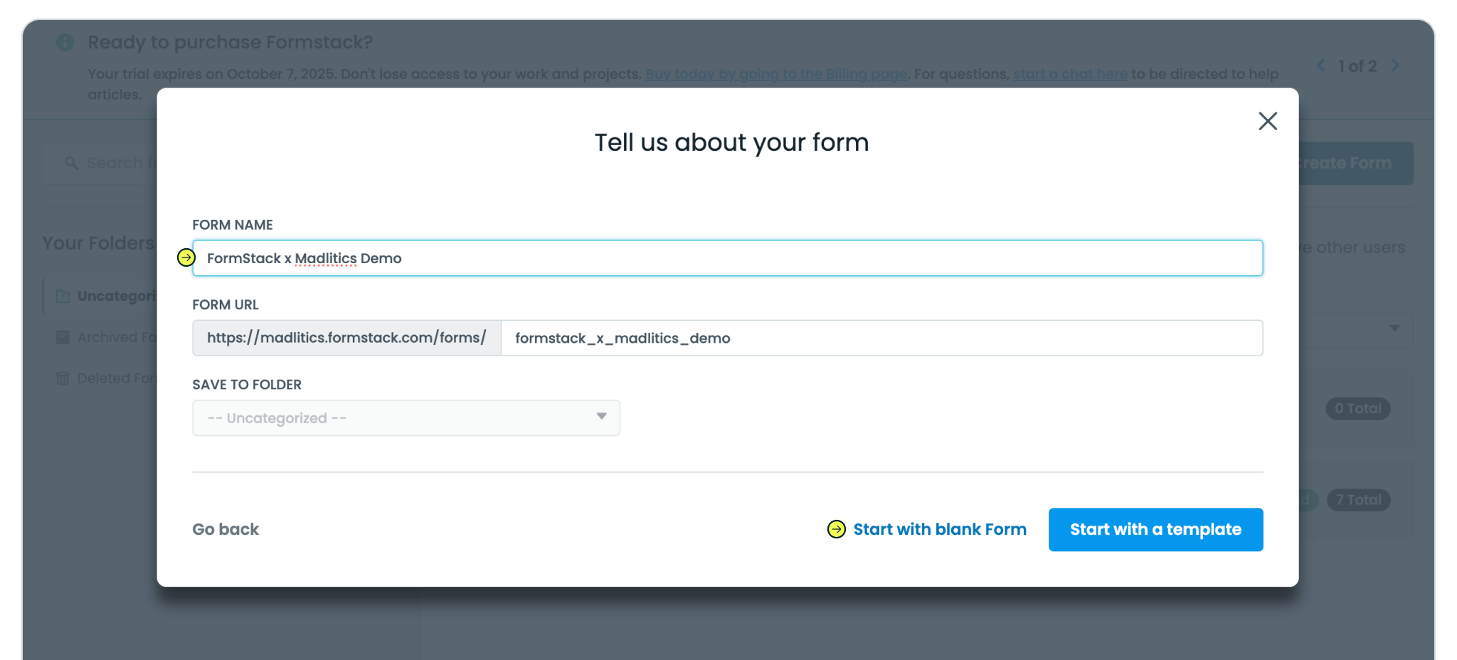 Finally, decide how you’d like to build: you can start with a blank form for total control or use one of Formstack’s templates to save time. Either approach works perfectly with Madlitics once we add the attribution fields in the next steps.