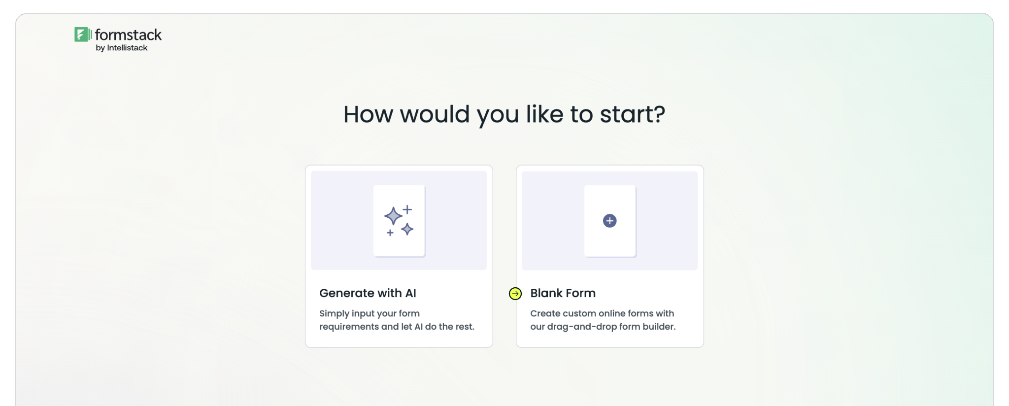With Formstack, starting fresh is simple. From your dashboard, click Create Form to kick off the setup process. You’ll be prompted to choose what kind of form you’d like to build — stick with the standard Form option to capture leads and attribution data.