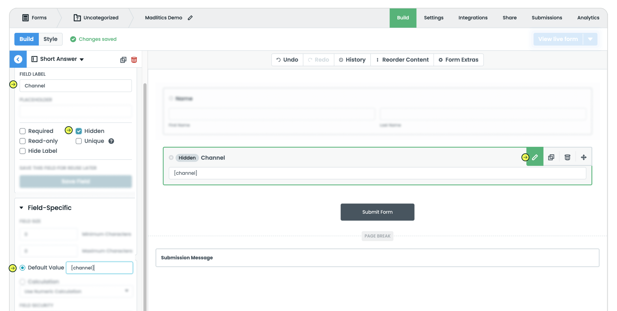 ). Check the box to make the field Hidden so it won’t appear to site visitors. Finally, set the Default Value under Field-Specific to the same target Madlitics Field default value(e.g., [channel]