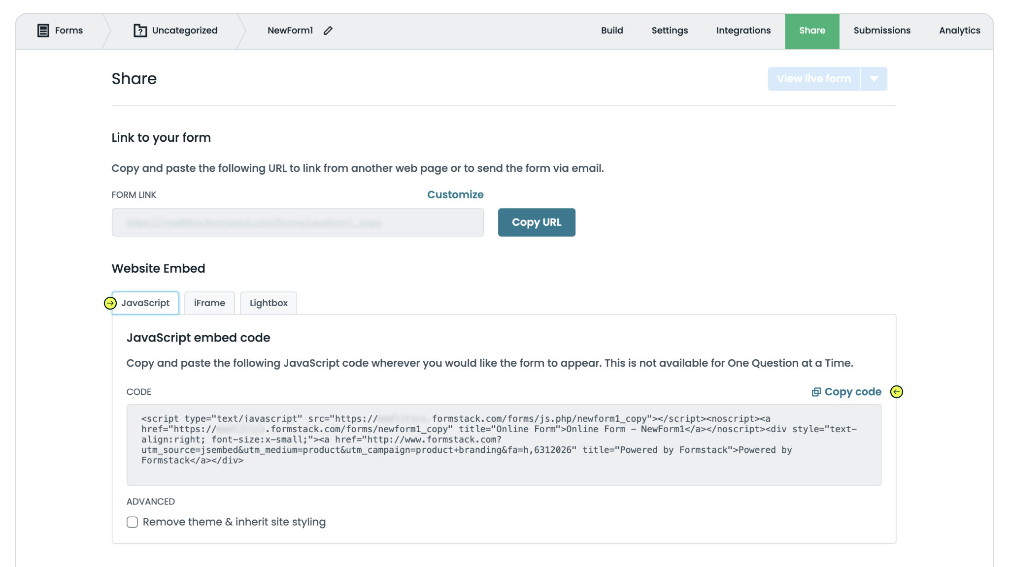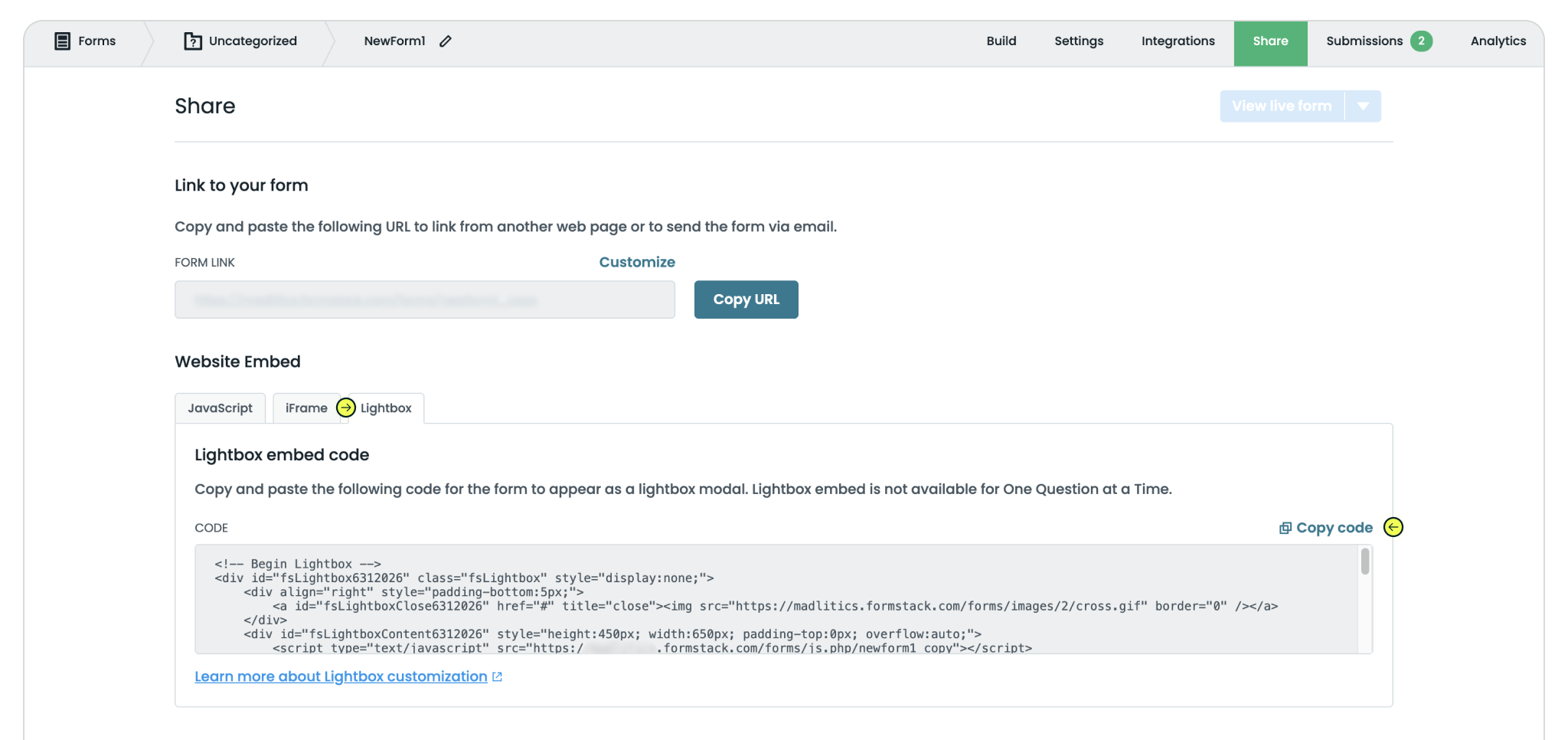 Once your form is ready, it’s time to embed it on your site so Madlitics can capture attribution data. Formstack gives you a few embed options on the Share tab — we recommend using JavaScript for the smoothest experience. If you prefer, you can also choose Lightbox, which displays the form in a popup window. Both work with Madlitics — it just depends on how you want the form to appear on your site.