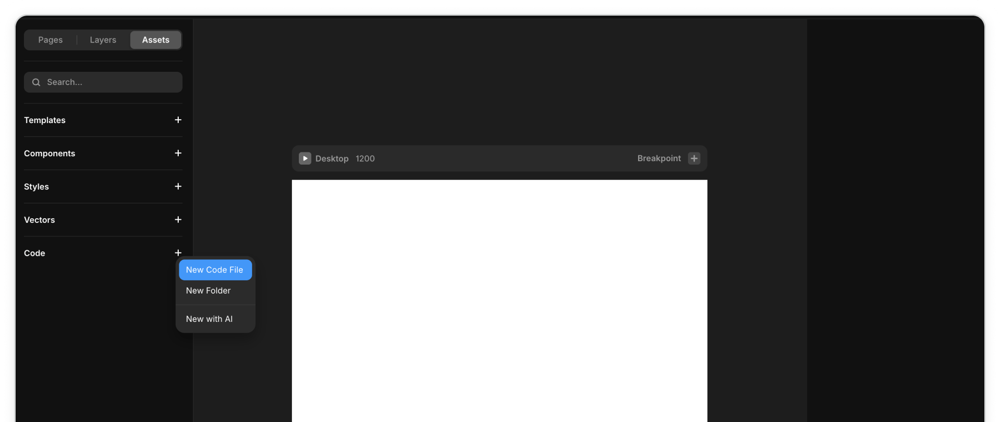 Unlike other platforms where you add hidden fields directly to a form, Framer uses code components to handle custom functionality. To begin, open the Assets tab in the left sidebar, scroll down to the Code section, and create a new code file. This file will hold the Madlitics fields that capture attribution data whenever your forms are submitted.