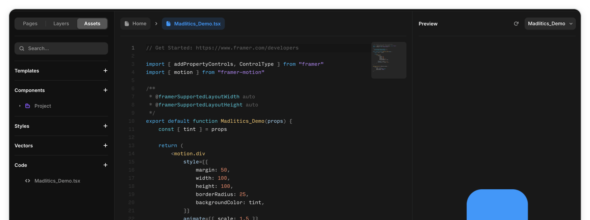 Once you’ve named your new file, Framer will automatically generate a code component you can edit. Think of this as the foundation where Madlitics will live inside your Framer project.