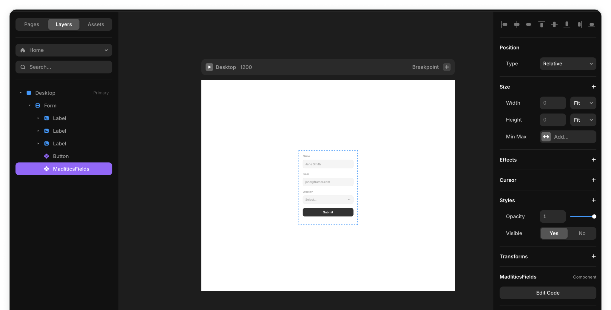 With the code ready, it’s time to connect it to your form. In the Framer canvas, start by dragging a Form element onto the page. Add your usual fields like Name and Email so visitors can fill them out.