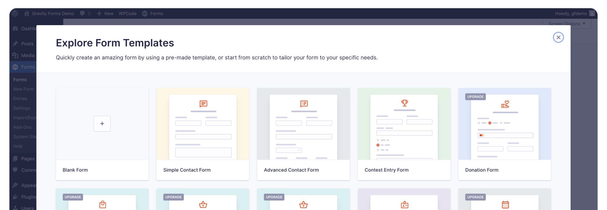 Navigate to the (Gravity) Forms menu item in the Wordpress sidebar. To create a new form click the 'Add New' button or select 'New Form' from the (Gravity) Forms submenu. Select the form template to use, and fill out the requested form details to get started.