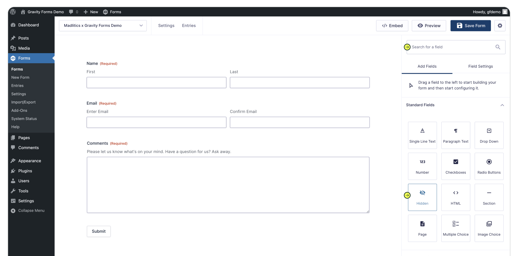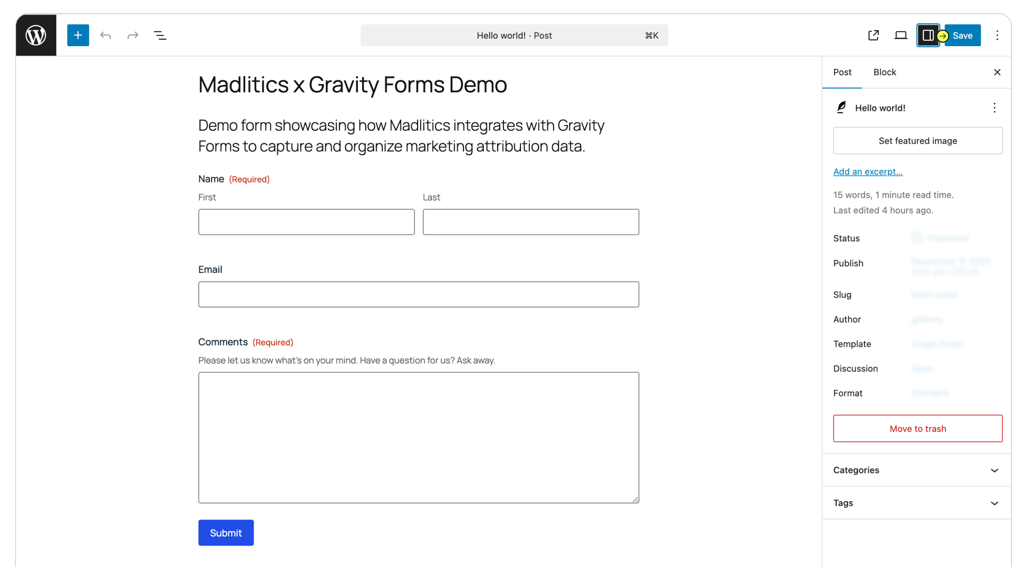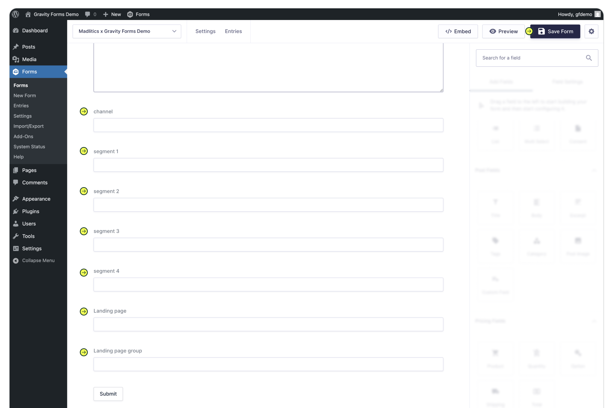 💆 Heads-up: Make sure Madlitics is installed on the site where this Gravity Forms form lives (ie. Wordpress). The form alone won’t capture attribution data — Madlitics needs to be running on the page to pass lead data into your submissions. Installing Madlitics on Wordpress ->