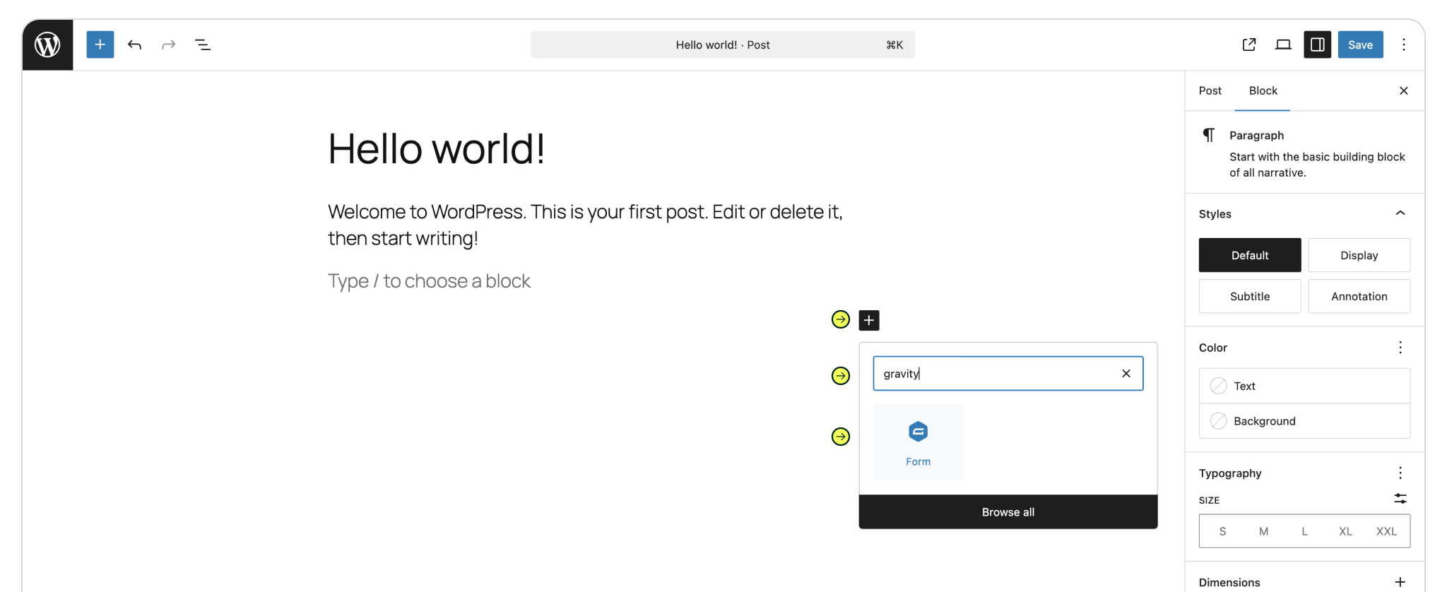 Add block > Search 'Gravity Forms' > Select Gravity Forms > Select form