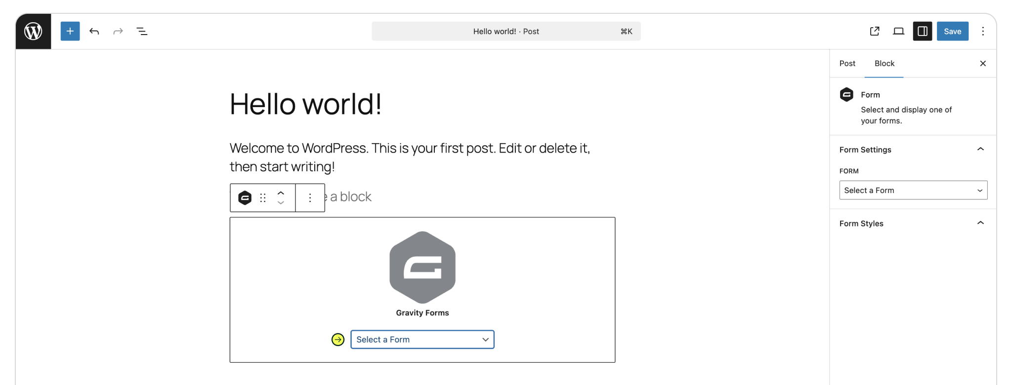 Select the page (or post) you want to begin capturing marketing data on, with the newly created form. In the page editor, select 'Add Block', search for Gravity Forms and click the Gravity Forms block component. Select the the name of the form, that includes the hidden fields, from the Select Form dropdown to embed it on the page.
