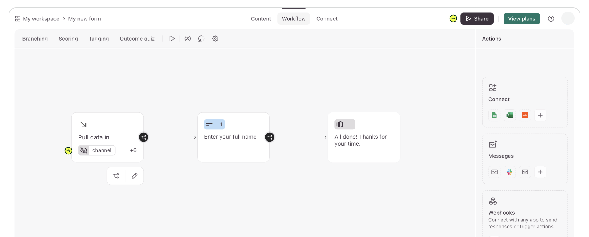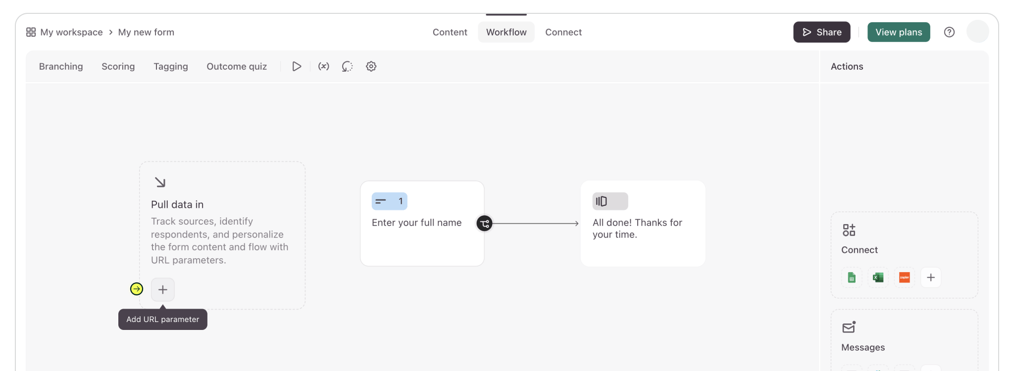 With your form structure in place, the next step is to link it with Madlitics so attribution data flows in automatically. Typeform makes this easy through its Workflow editor, where you can pull in URL parameters and map them directly to fields inside your form.