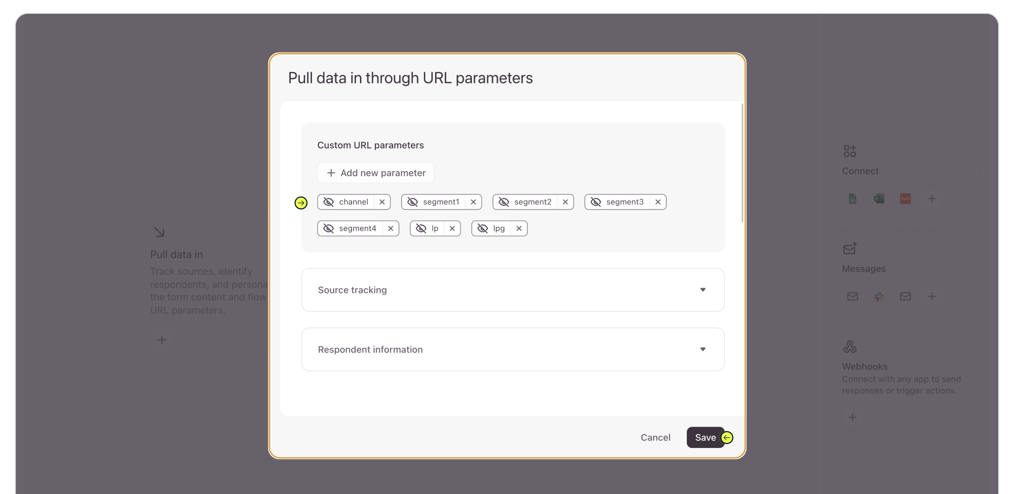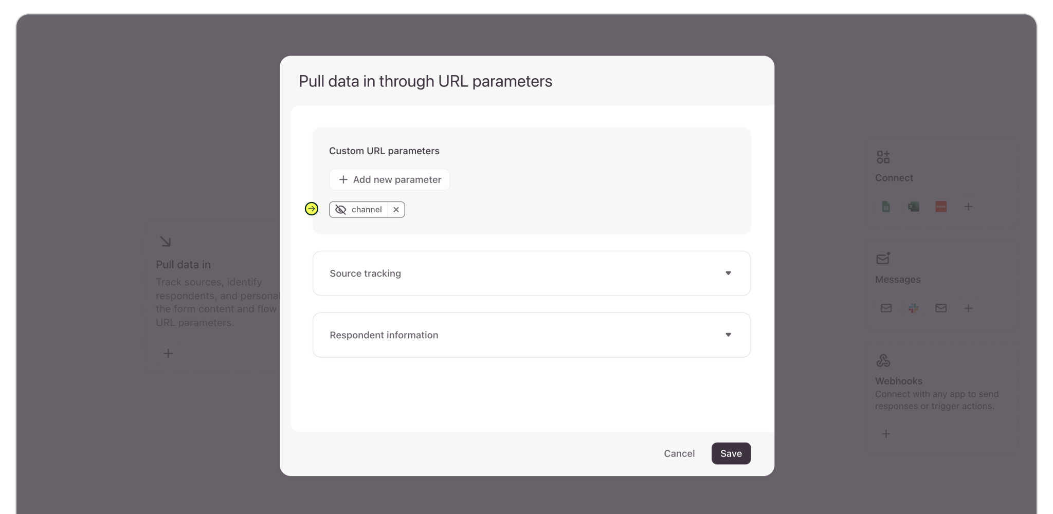Access Workflow tab at the top of the page. Inside Pull Data In component > '+', to add URL parameters. Within Custom URL Parameters > + Add new parameter. Name the parameter channel