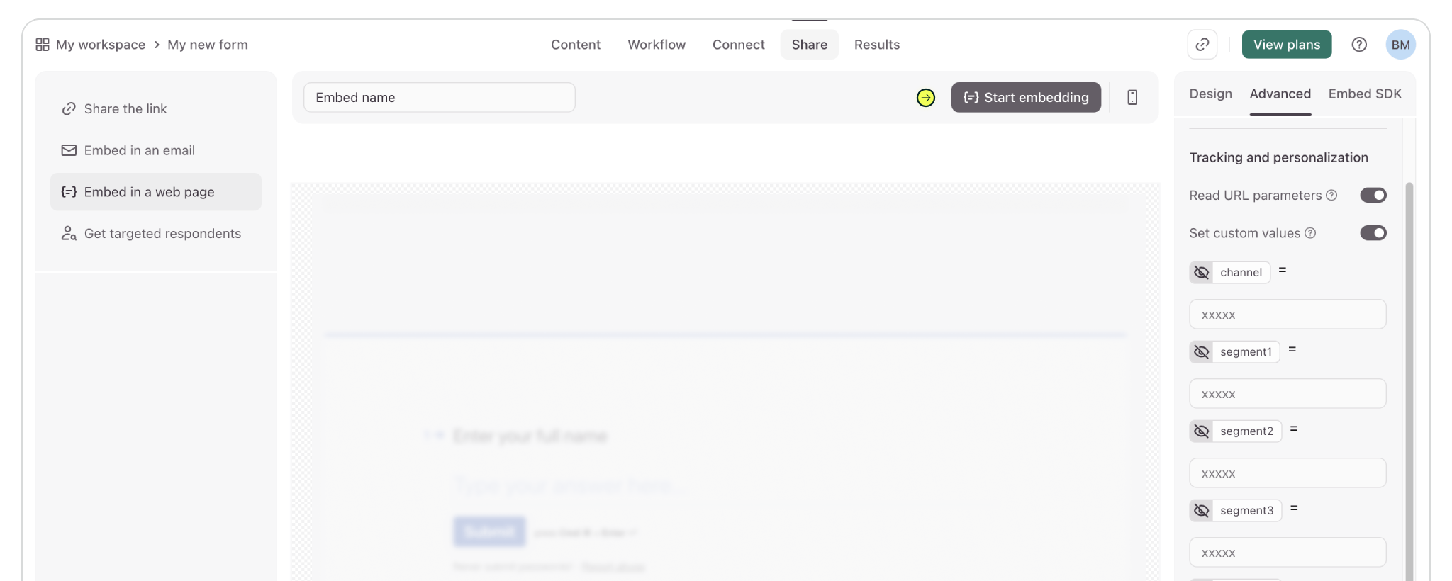 Start by clicking the Share tab in Typeform. From here, choose the option to Embed on your website. On the Share page, select Embed in a web page. You’ll see the embed settings panel open up. The Design tab lets you choose between different embed modes — like standard, popup, or full page — so you can decide how the form should appear on your site. Switch over to the Advanced tab and you’ll see the Madlitics field parameters listed out. This ensures all the attribution values — channel, campaign, landing page, and more — will pass through automatically with each submission.