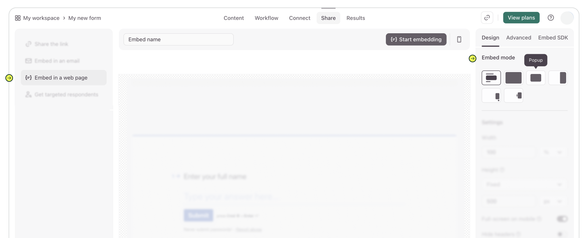 When you’re ready, click Start embedding. Typeform will generate the embed code you need to paste into your website, completing the setup.