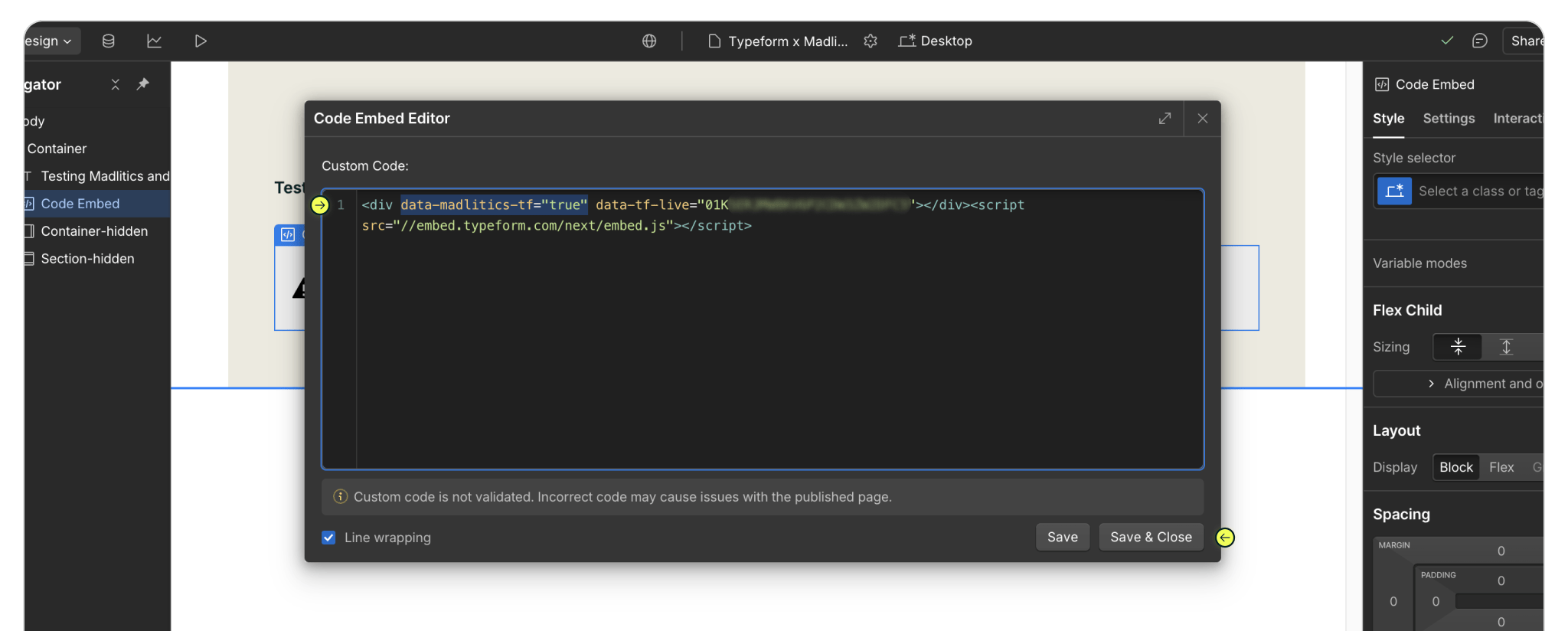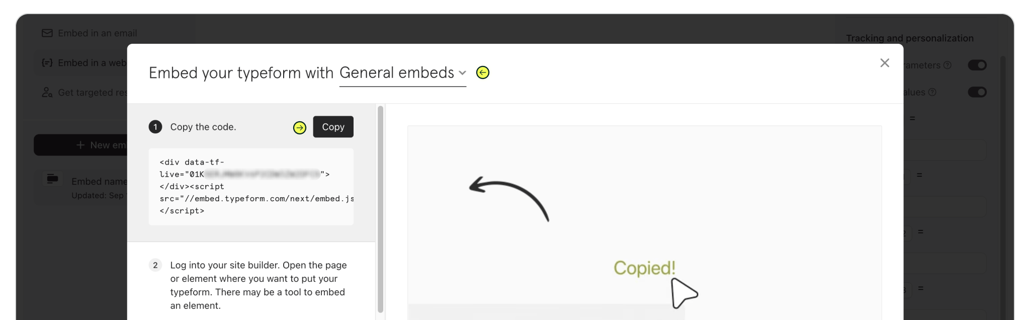 Once you’ve copied the embed code from Typeform, the final step is to make sure Madlitics is enabled. No matter which embed style you choose, Typeform will generate the same code, and you’ll paste it into your site as usual.