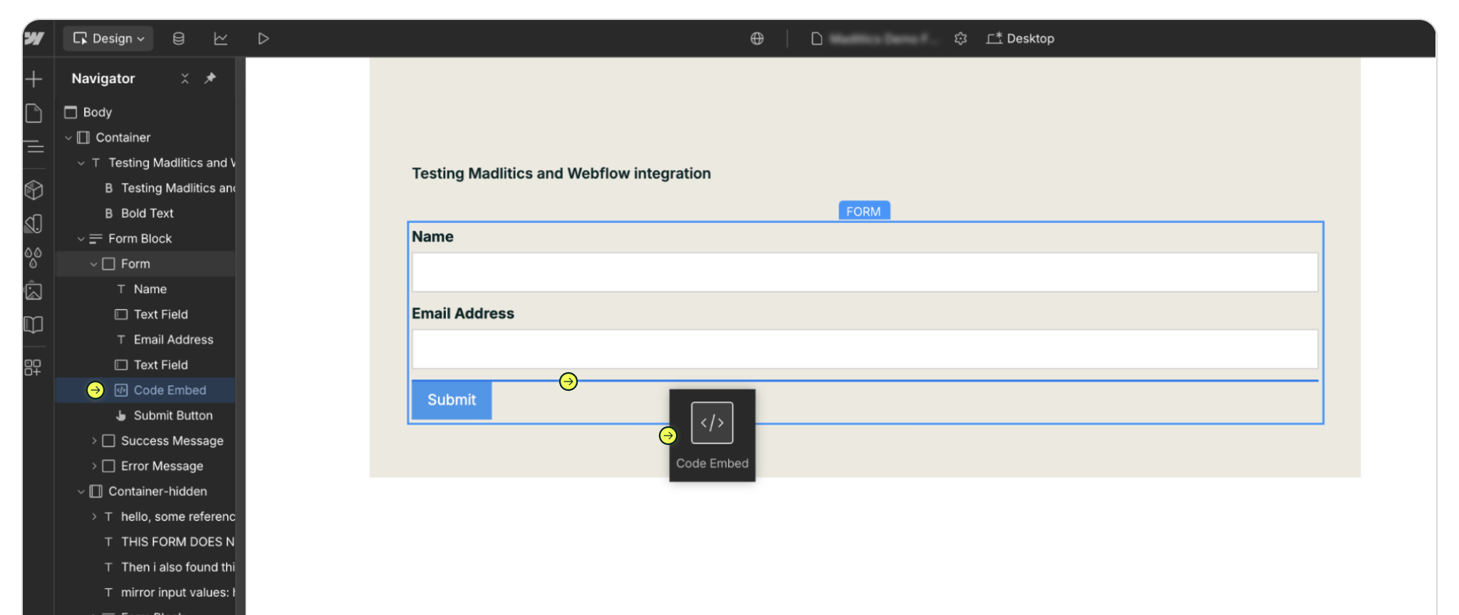 With your form in place, it’s time to prepare it for Madlitics. Open the Add Elements panel again and look for Embed Code. Drag it into your form, making sure to place it just above the Submit button. If you’re not sure about positioning, check the Navigator panel on the left—it shows the full form structure and makes it easy to confirm the embed sits neatly above Submit.