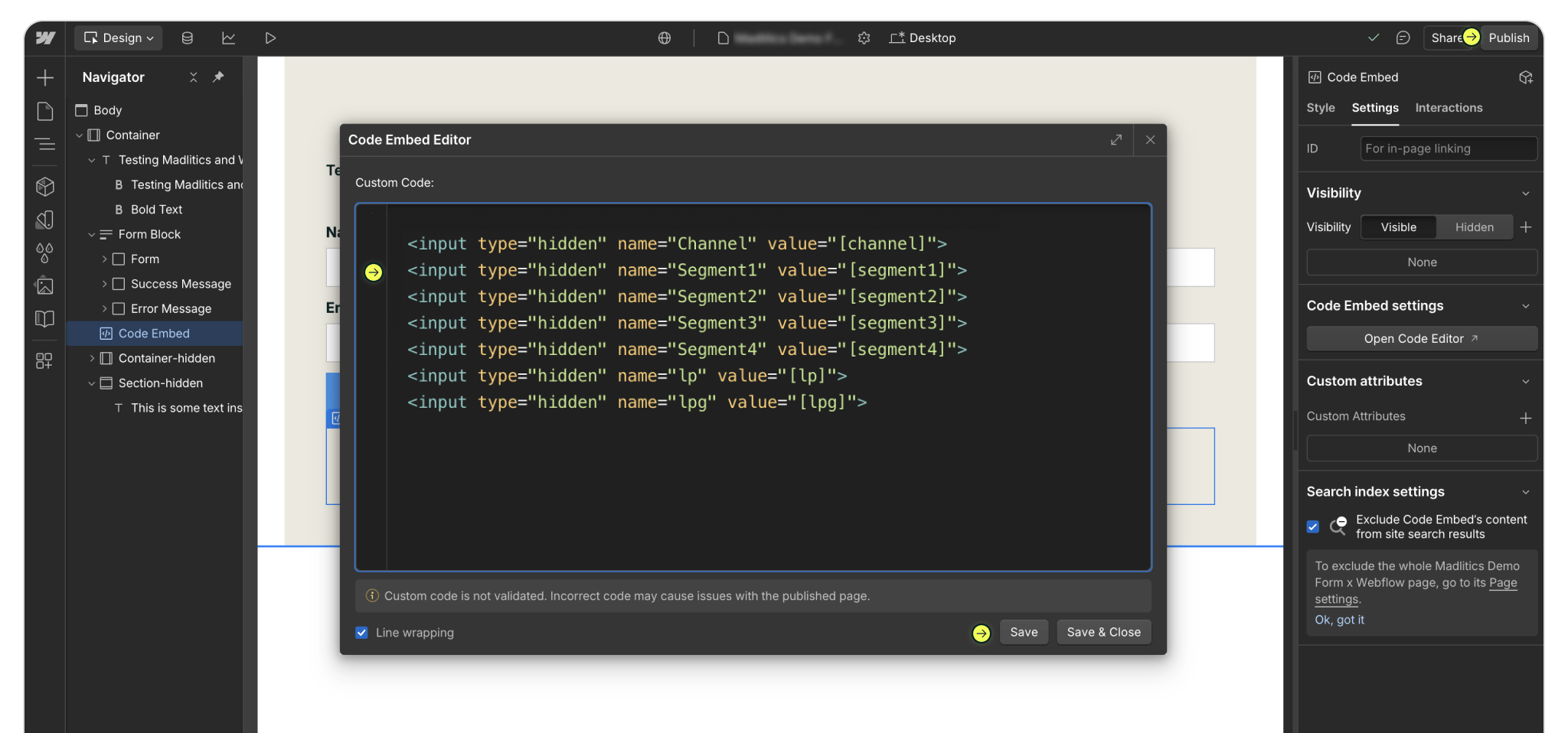 Click on the Embed you just added and open the code editor. This is where you’ll paste in the full block of Madlitics fields that handle attribution data for every submission. Drop in the snippet below and save your changes — the fields won’t appear visually in your form, but they’ll quietly capture details like channel, segments, and landing page for each lead. Configure additional Madlitics field value pairs for deeper customization and richer insights.