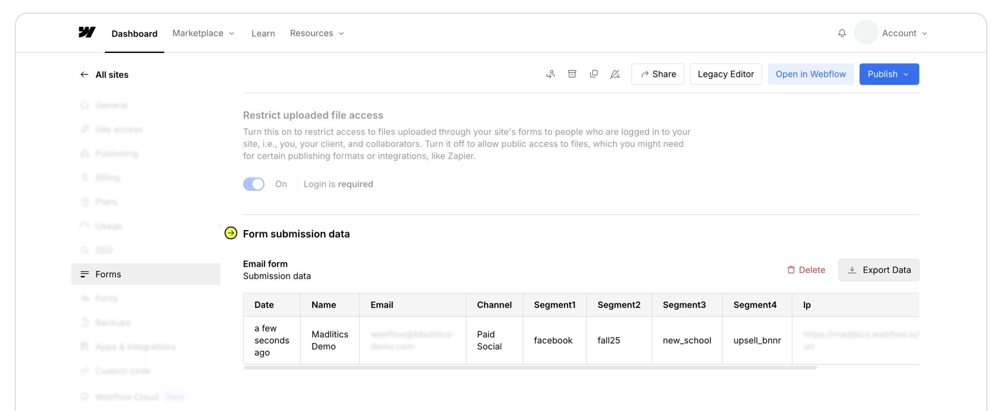 Once your fields are in place, publish your site so everything goes live—scripts like Madlitics don’t run in preview mode. Open the published page, fill out the form yourself, and check the submission in your Webflow Forms dashboard. You should see attribution data like channel, campaign, and landing page captured alongside the lead details. That’s your confirmation that Madlitics is up and running.