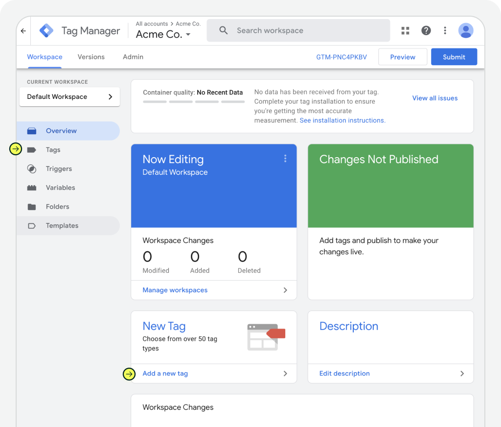 Once your container is created, you’ll land in the GTM workspace — and from here, you’ll be able to add and manage your tags without editing your site’s code.