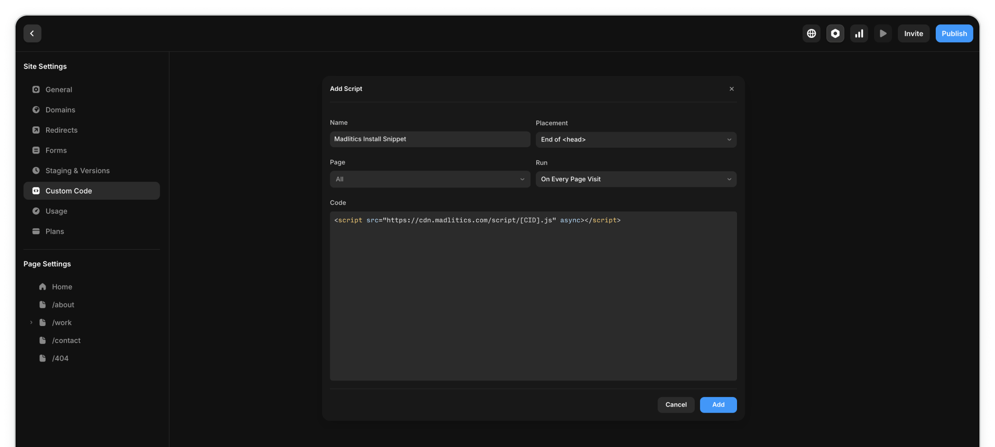 Click Add Script to create a new custom snippet. Give it a name so you can easily identify it later — something like “Madlitics tracking.” Set the placement to End of <head>, and make sure it’s set to run on All Pages and every page visit.