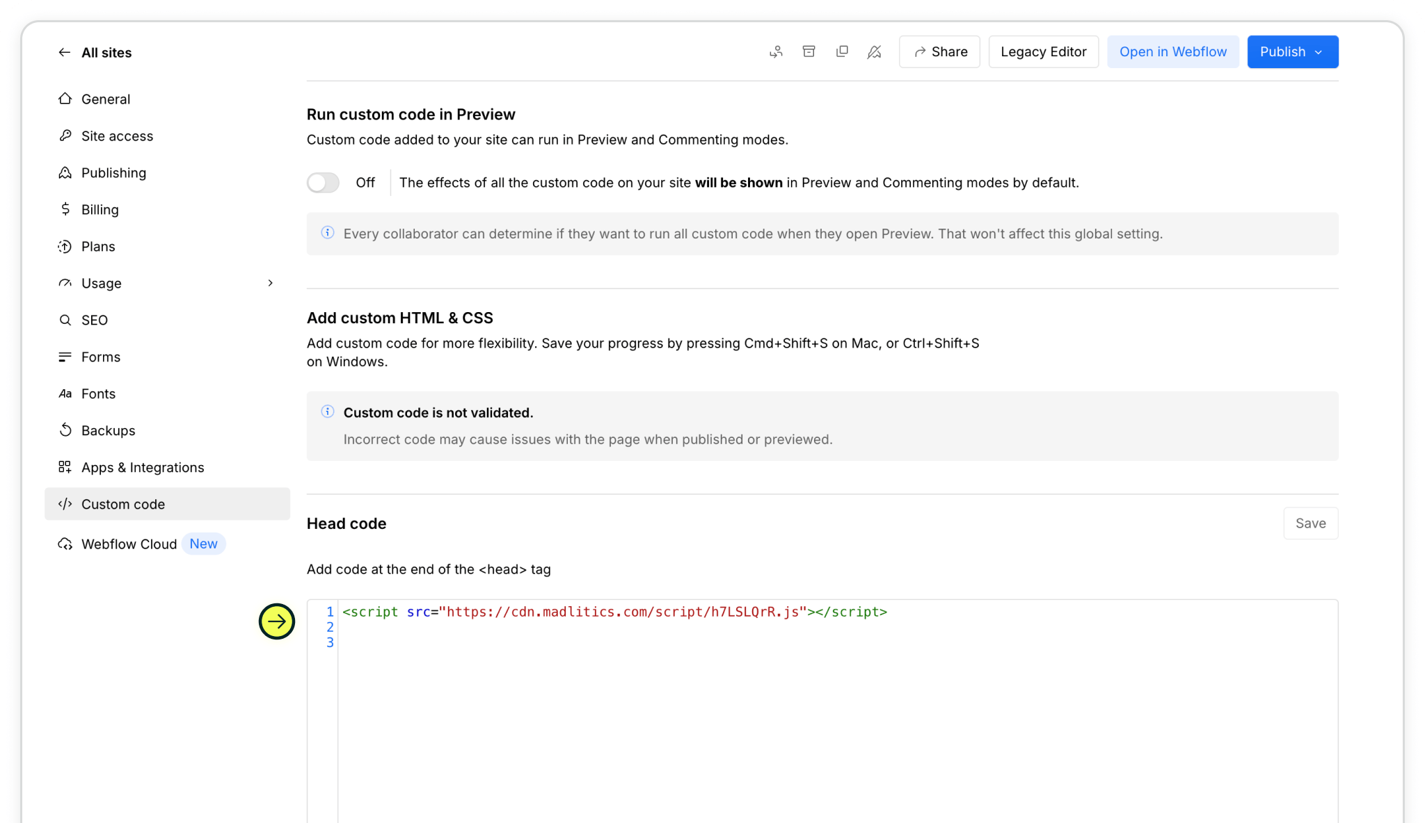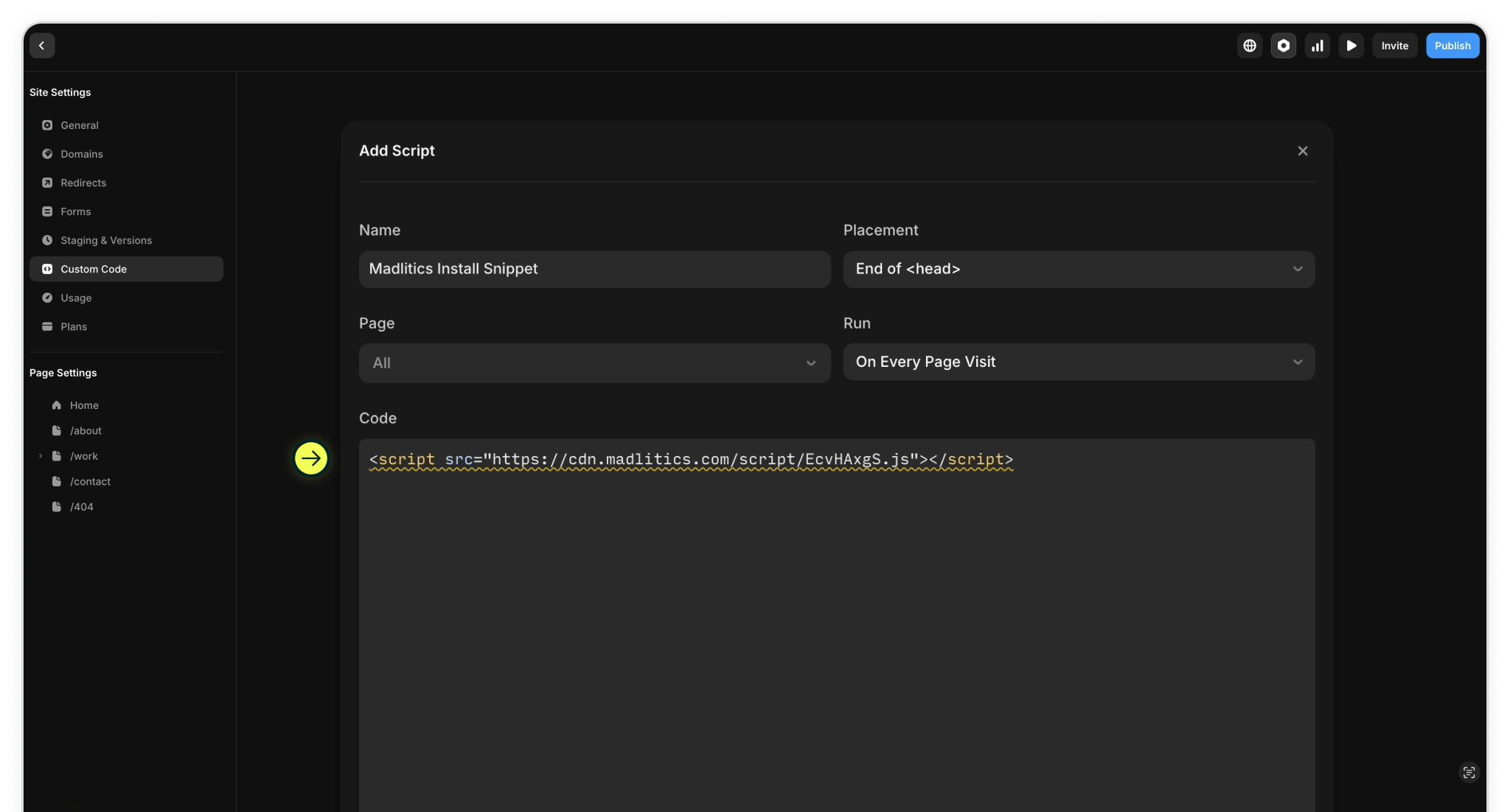 Paste the Madlitics code snippet right after the <head> tag on every page of your site — (ideally) before any other scripts. This ensures visitor data is captured immediately, even if someone leaves the page early. Be sure the script is included on all pages, including standalone landing pages and those with forms, so Madlitics can track the full visitor journey.