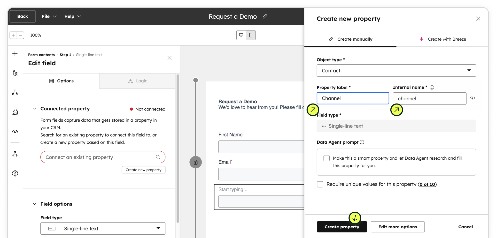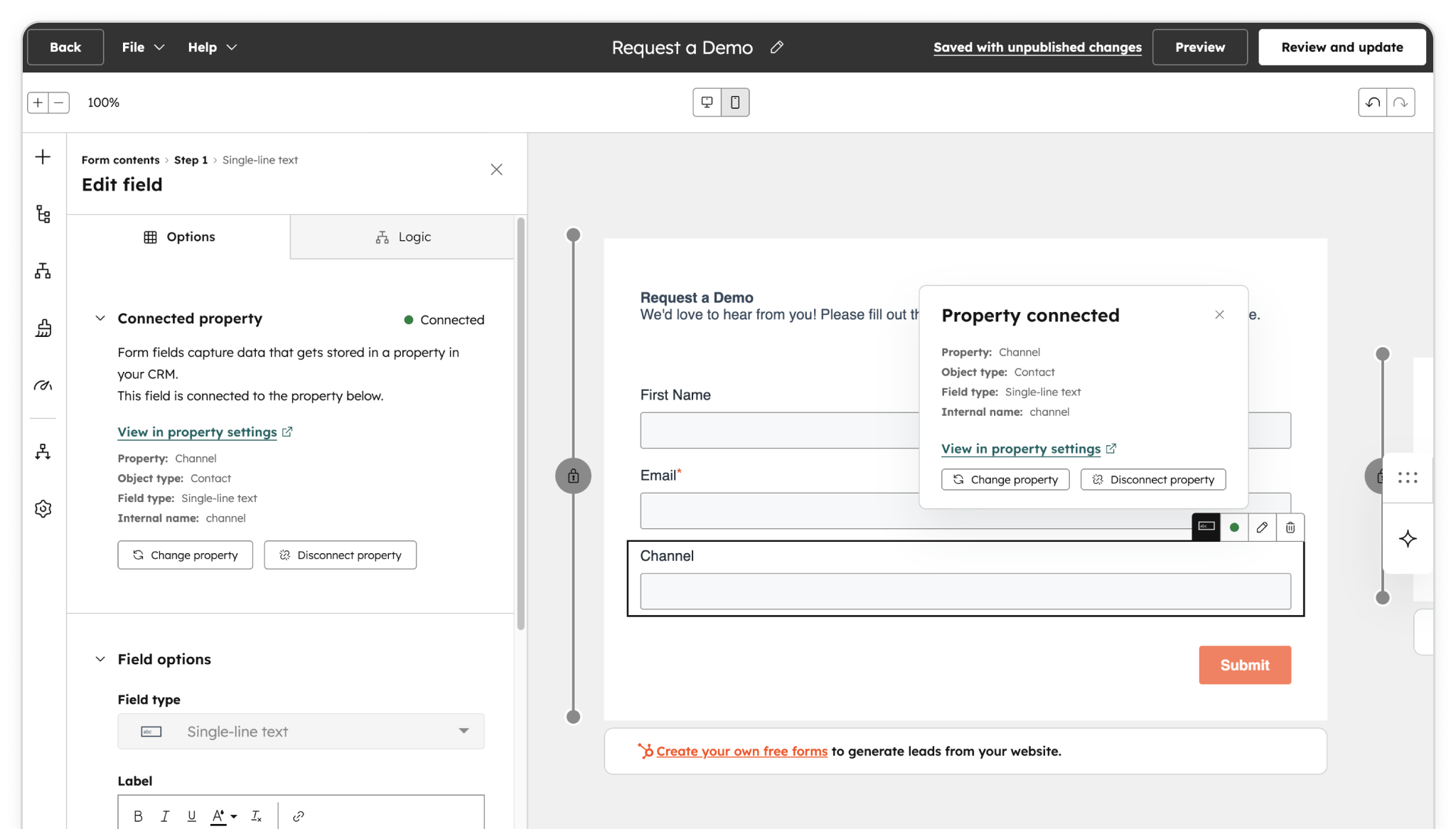 Create a custom property: Select the single-line text field and it's Edit field panel, under Connected property, click the Create new property button. Set the Property label to the first Madlitics field, Channel and the Internal name to channel (no spaces or underscores). Click the Create property button to save — you'll see a "Property connected" confirmation.