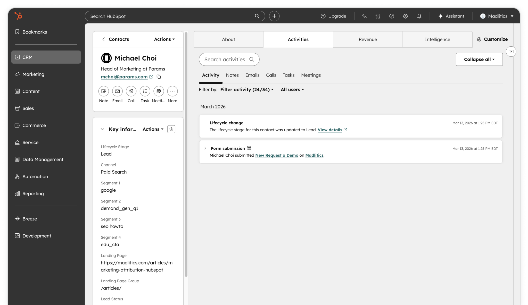 Submit the form as a visitor would. You should see values like channel: "Paid Search", segment1: "google", and landingpage: "/your-lp-url" alongside standard lead fields. HubSpot form submission showing Madlitics attribution data captured successfully—channel, UTM segments, and landing page details now flow into contact records.