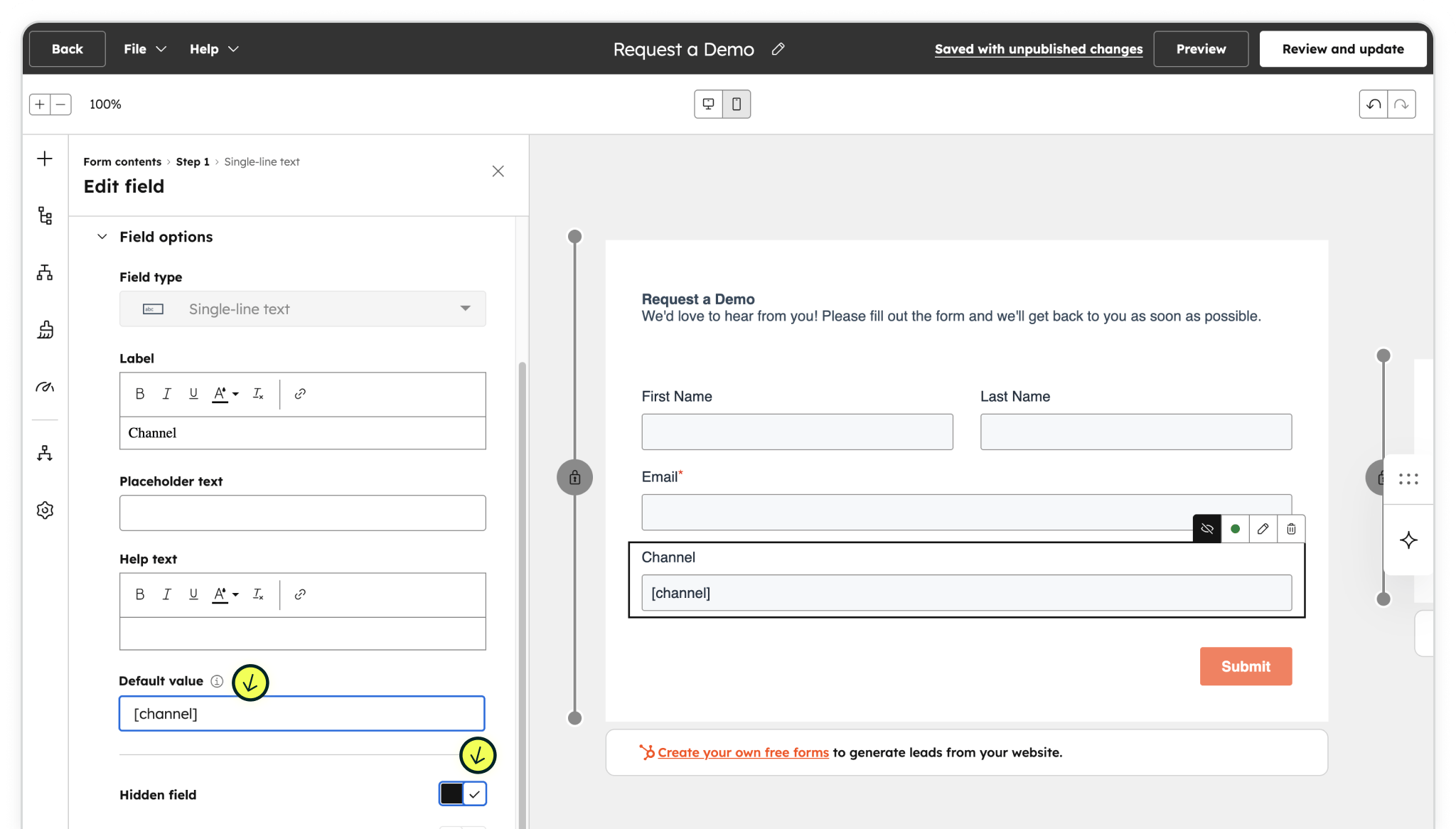 With all Madlitics fields added and connected to custom properties, click Review and update in the top right to finalize your form. HubSpot forms now capture complete first-touch attribution data with every submission, flowing directly into contact records and reports.