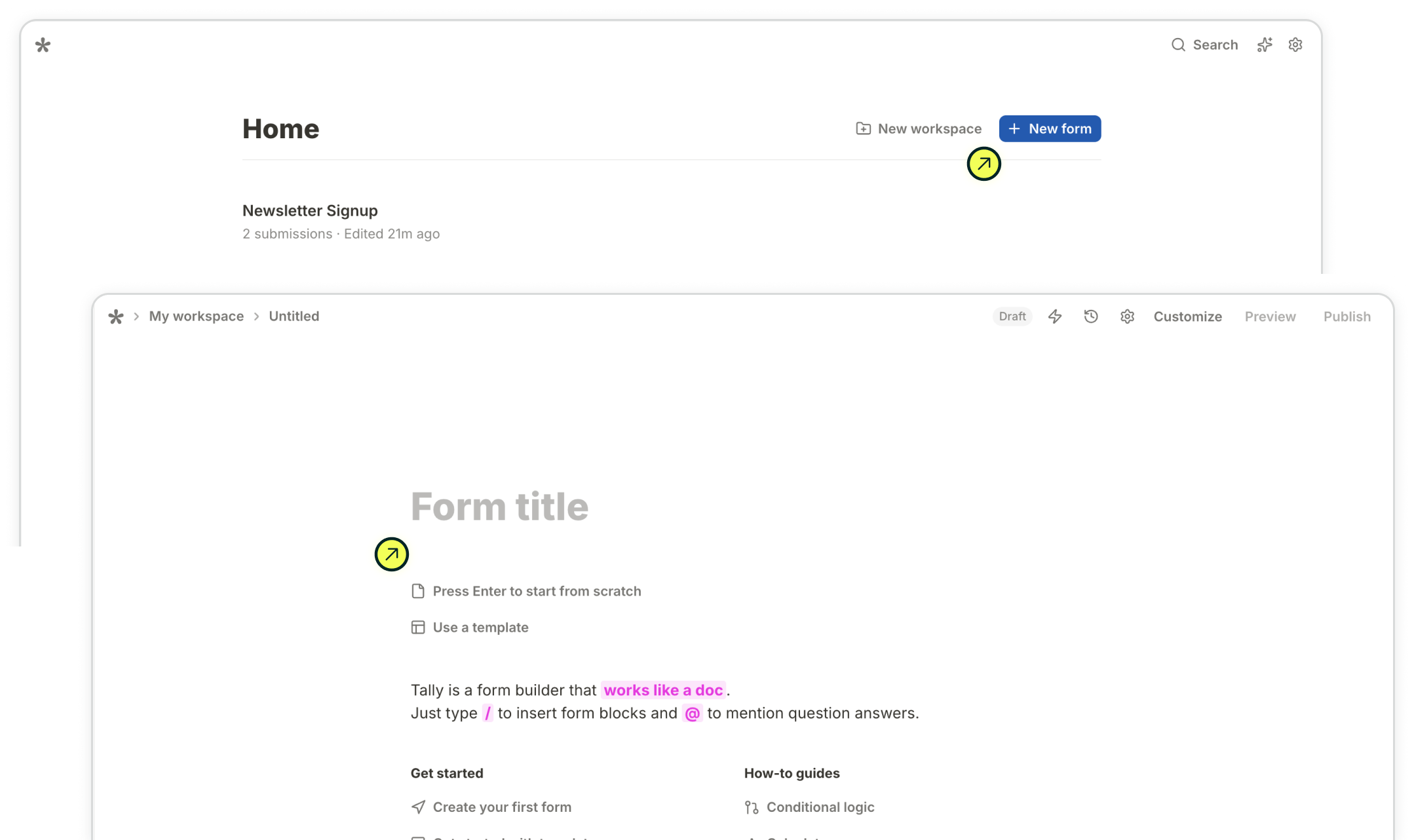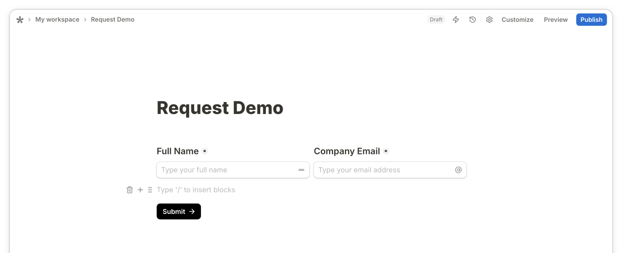 Give your form a title, then start building by adding blocks or using Tally’s inline notation to create questions, fields, etc as needed.