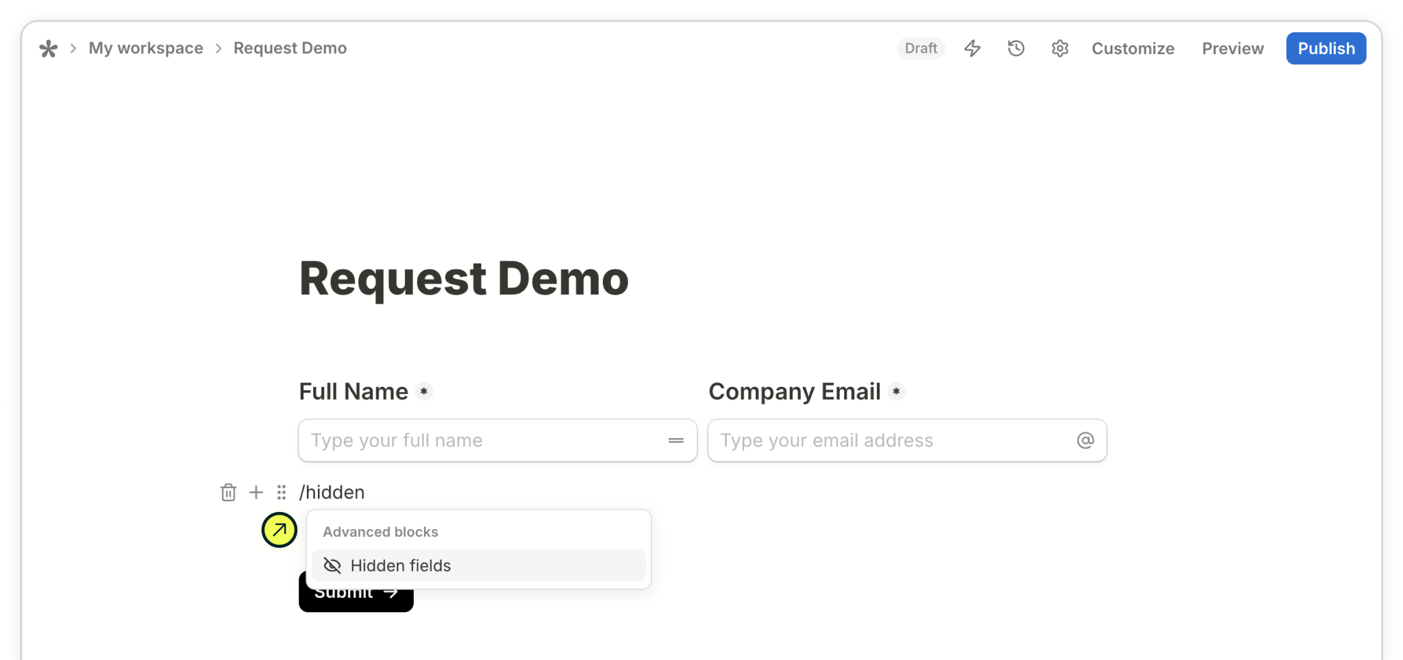Once you’ve built your form, it’s time to add the hidden fields Madlitics will use to write attribution data. In Tally, click 'Add block' and choose search for a Hidden field or use the inline notation /hidden.