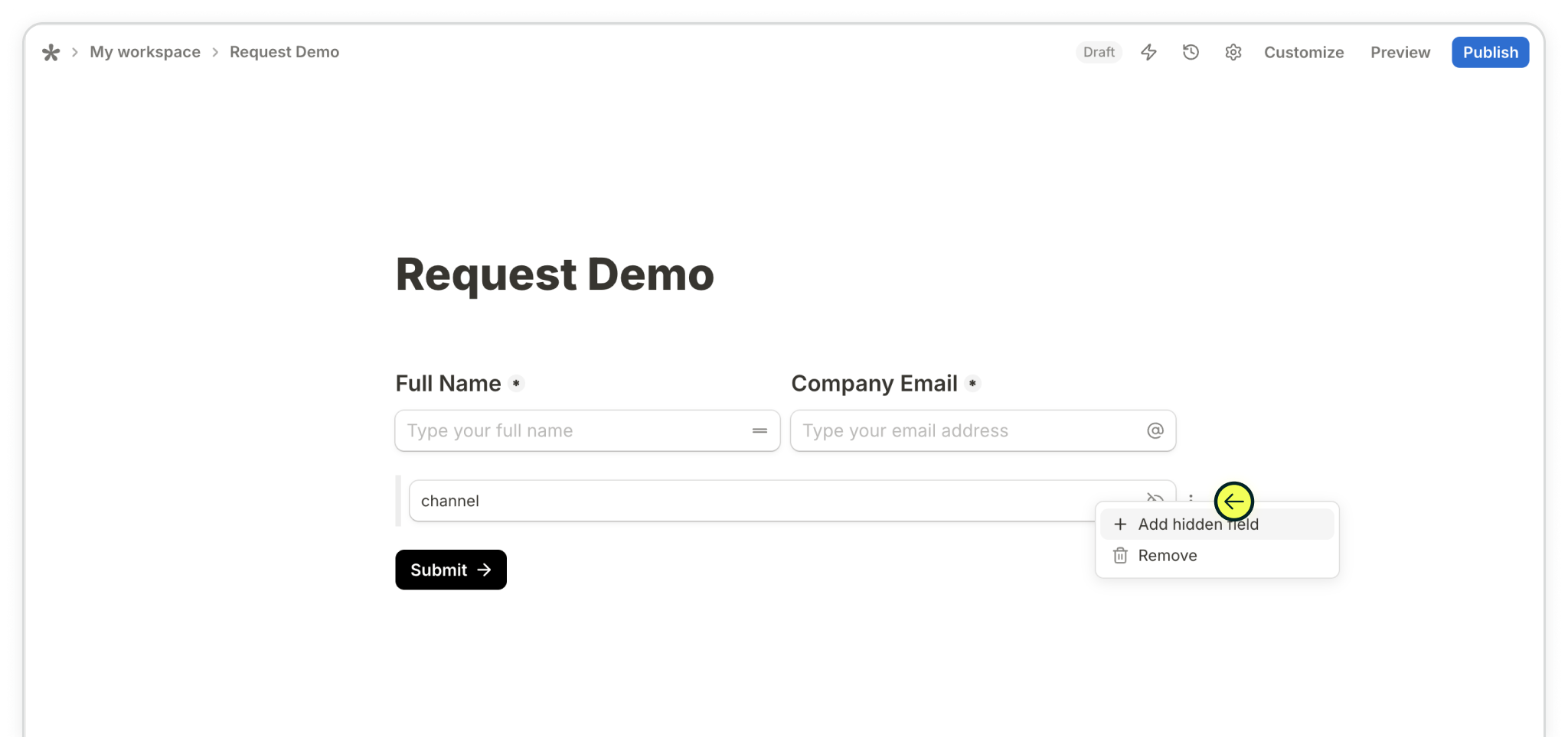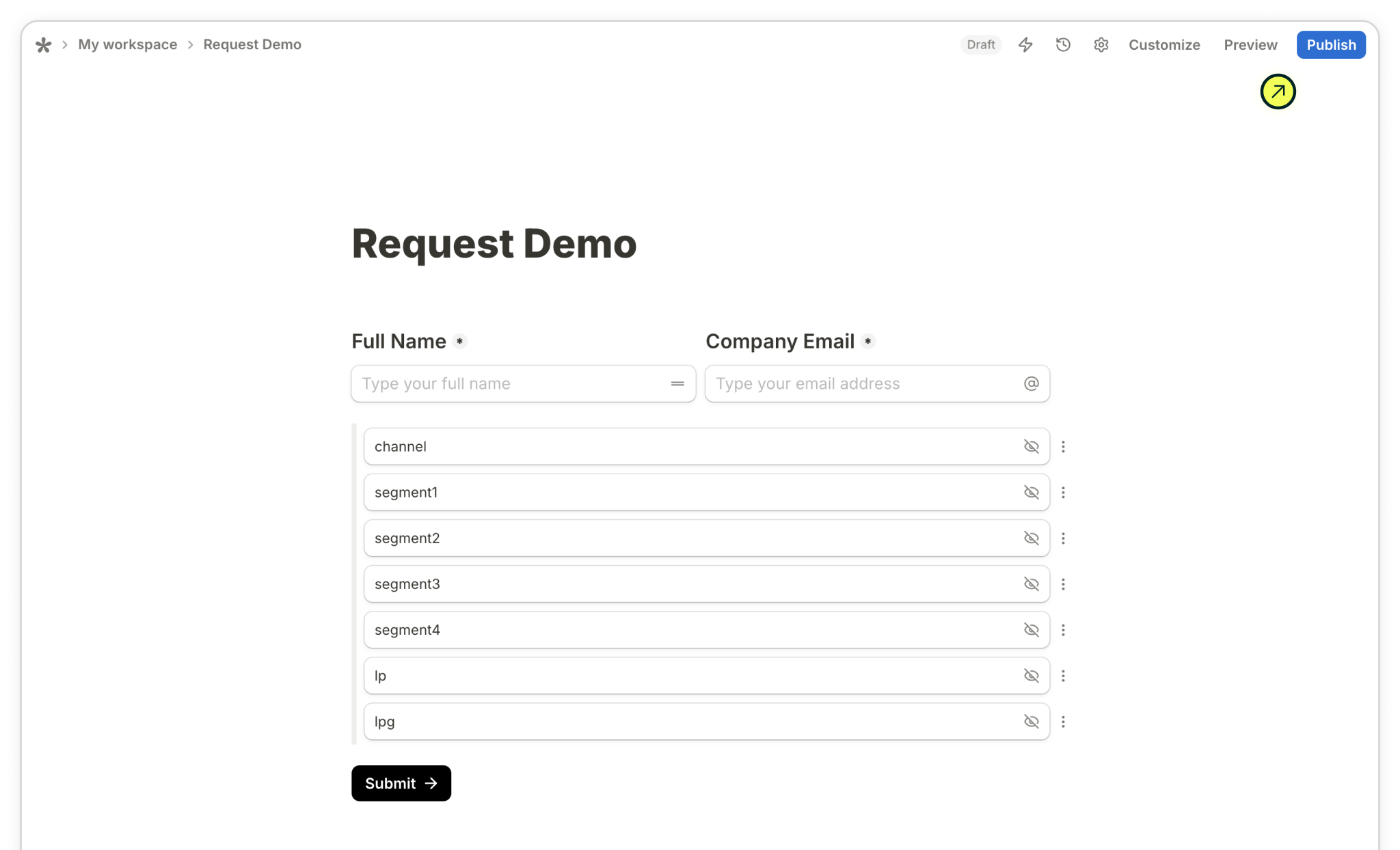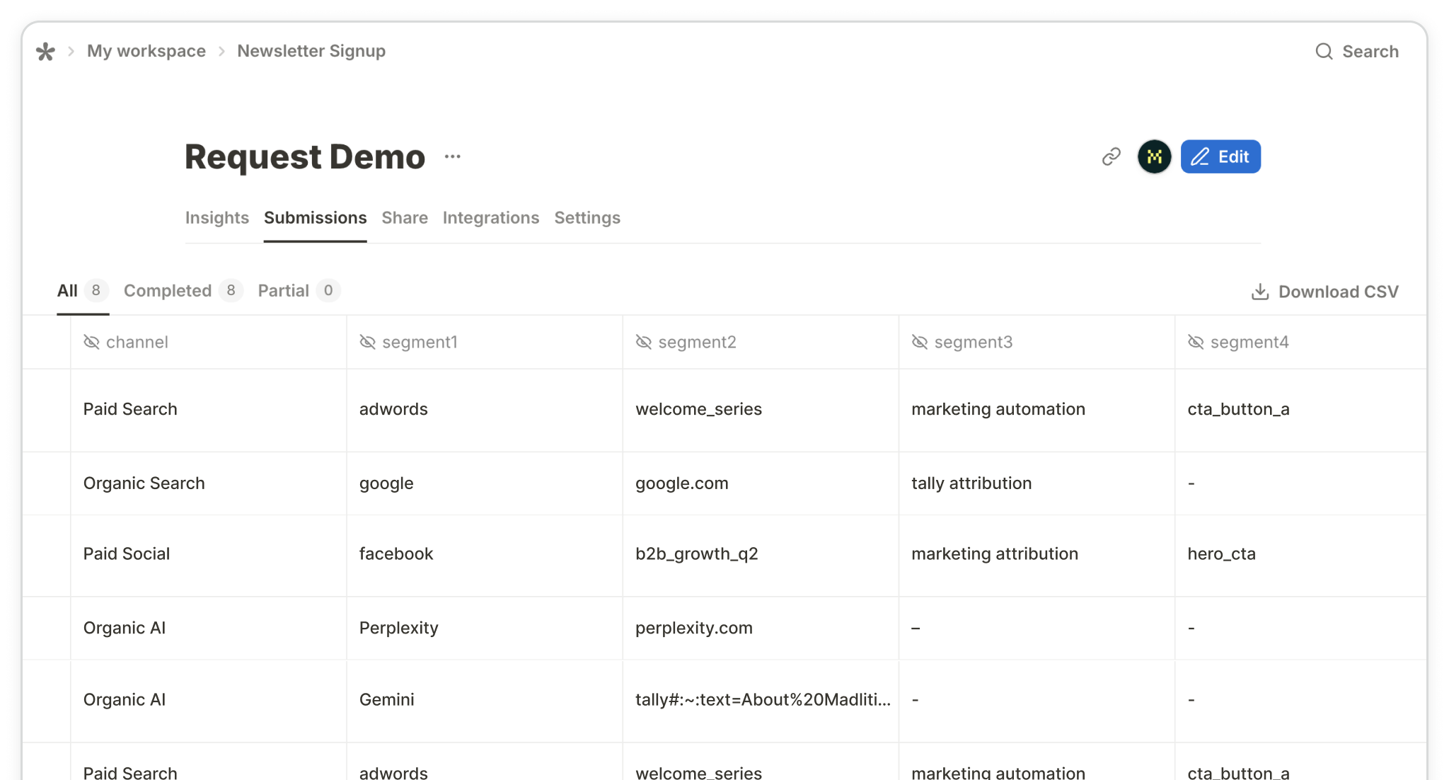 Test your form by visiting your site, using a url with unique utm parameters. Captured attribution data will populate in your Tally submissions page which can then be passed to CRMs, Intelligence tools, etc. for advanced reporting.