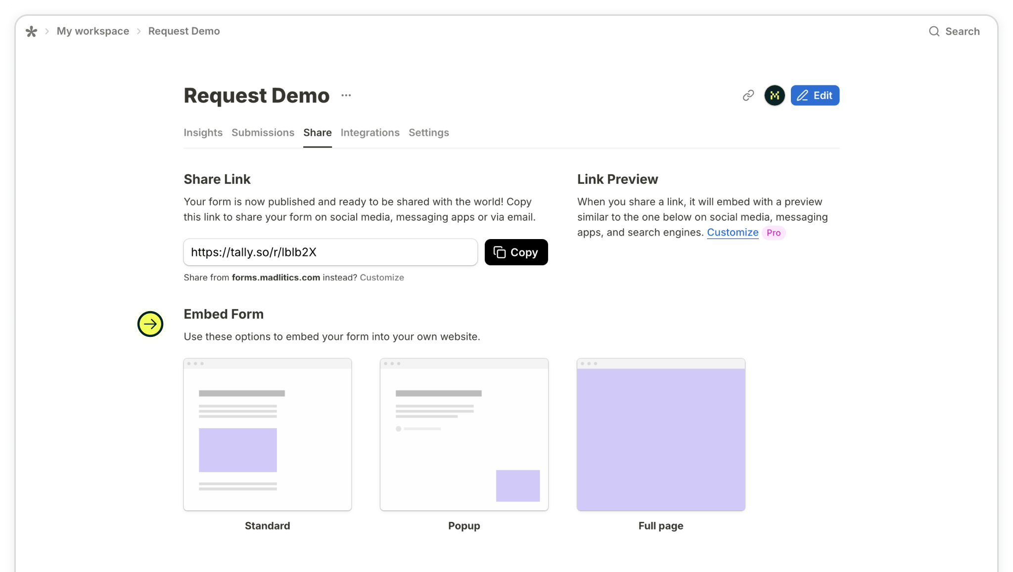 Click 'Publish', then choose how you’d like the form to appear — Tally offers several options including a standard embed, popup, or full-page form.