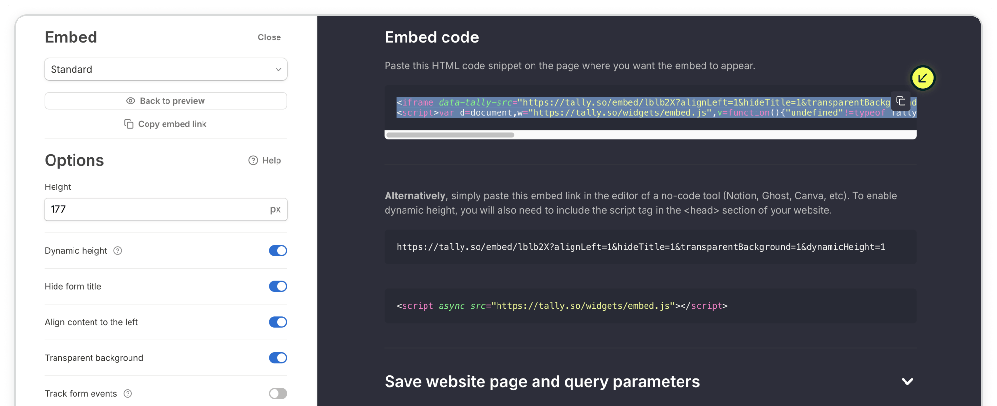 Select your preferred display style and click 'Get the code'. Copy the embed code and paste it into your website where you want the form to appear.
